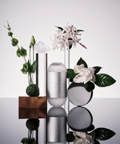 Pode ficar de pé ou deitada. Com uma surpresa no interior: não passa apenas por um design arrojado com vidro e metal, com formas familiares arquitetónicas, é também funcional – dois frascos num só! Um fica em casa, o outro passeia na sua mala ou saco de viagem.